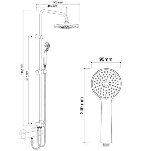 shower system icon with overhead shower, handshower with three jets, anti-lime-scale, to connect to your existing tap.